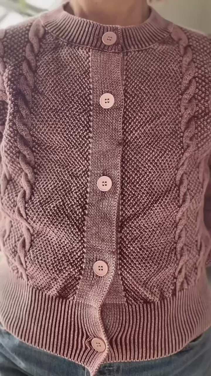 Crafted from a blended knit with a lived-in wash, it delivers classic cable detailing with a relaxed, broken-in feel from the first wear. The button-front closure and versatile silhouette make it endlessly wearable—throw it over a simple tee and jeans for weekend ease, or layer it over a slip dress for an elevated, textured contrast.